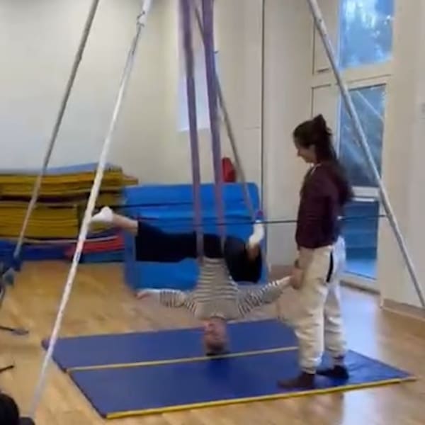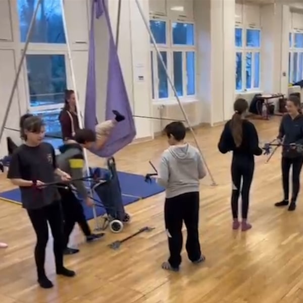 Parallèlement aux cours d’EPS, les élèves participent à 6 heures de pratique circassienne avec Eline, de la compagnie Duo Juste à Deux, pour découvrir notamment le ruban, entre technique, expression corporelle et dépassement de soi.