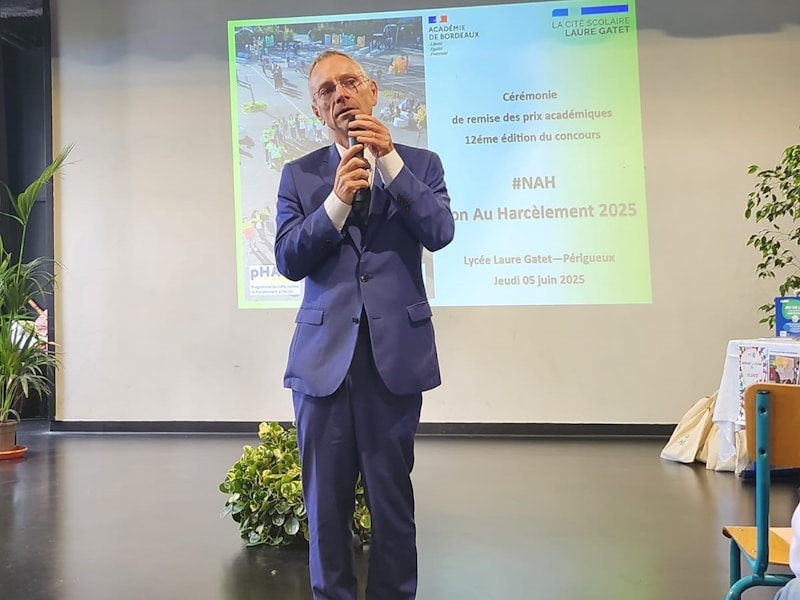 La cité scolaire Laure Gatet a eu l’honneur d’être choisie pour recevoir cette année la cérémonie de remise des prix du 12ème concours #NAH Non Au Harcèlement, présidée par M. Huart, recteur de l’académie de Bordeaux (photo 1) en présence de Mme Malabre, IA-DASEN de Dordogne, Mme Lemonnier, référente académique de la lutte contre le harcèlement scolaire et M. Mas, délégué académique à la vie lycéenne et collégienne.